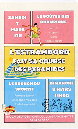 – Goûter des champions samedi 17H et Brunch sportif dimanche à 11H, organisés par le restaurant l’Estrambord